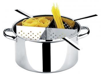 Espagueteira totalmente feita em aço inox, não solta nenhum resíduo nos alimentos, mantendo-os saudáveis, seu desenho limpo e sem cantos torna a limpeza muto mais fácil, o fundo triplo da espagueteira distribui o calor uniformemente, proporcionando um cozimento mais rápido.