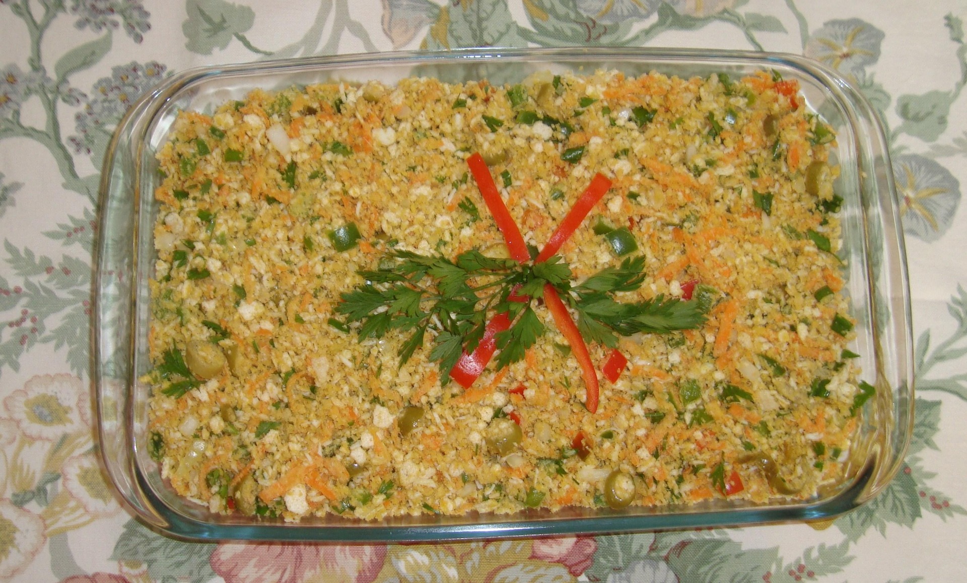 Levar ao fogo 1/2 kg de carne de sol (que ficou de molho cortada em pedacinhos). Junte 100grs de toucinho picadinhos e um pouco de banha. Deixar fritar muito bem. Acrescentar coentro e cebolinha picados. pode também colocar pimenta. Juntar farinha e um pouco de água fervente até formar a farofa.