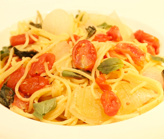 PREPARO: Doure a cebola no azeite. Junte as abobrinhas, os tomates, o caldo de galinha, o manjericão e refogue pôr 10 minutos e reserve. Mistura os ovos, o queijo, a salsa, a mistura reservada e junte ao macarrão cozido, misturando bem. Sirva a seguir.