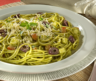 Escorra a massa despeje no refratário, regue por cima o pesto de manjericão e com a ajuda de dois garfos grandes mexa delicadamente até envolver bem todos os ingredientes.